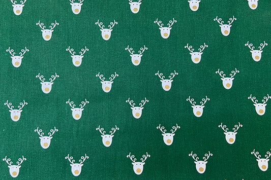 White reindeer head on green 100% cotton print